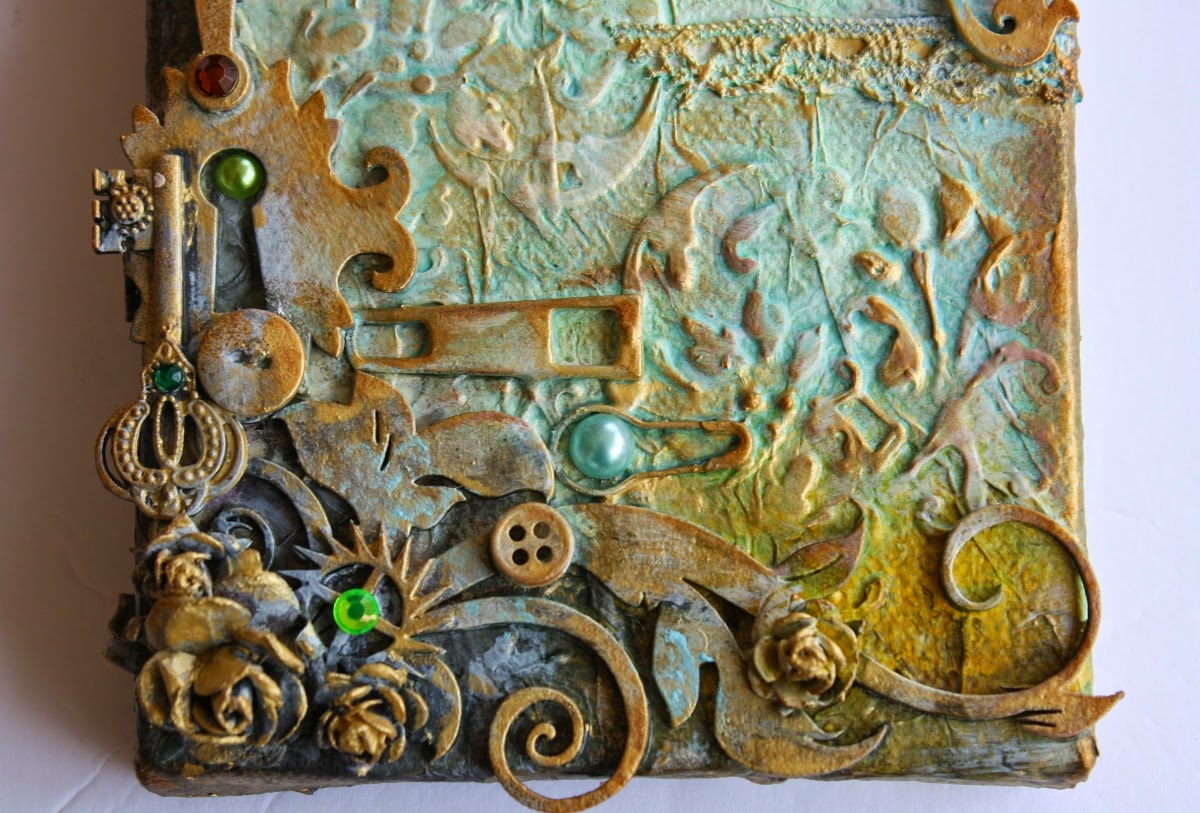 I added some textures with molding paste and some stencils and used the Shimmerz NEW 'Ride the Tide' Creameez and 'Giddy About Green' Inklingz with 'Miner Miner 49er' Inklingz to get the verdigris (aged metal) look.